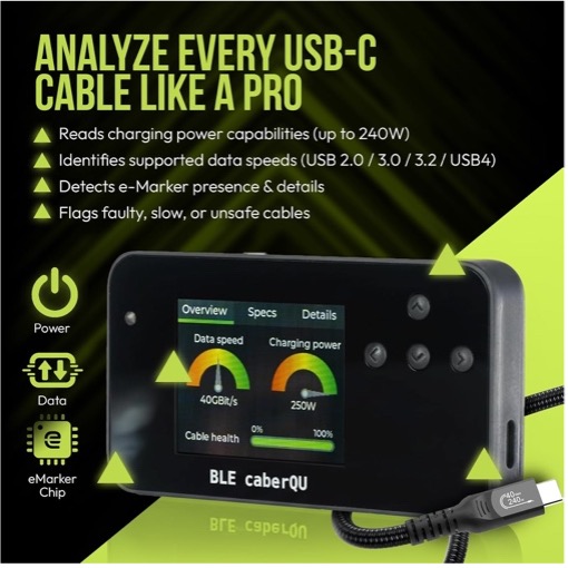 The BLE caberQU tester arrived, and I also downloaded the associated app from the Appstore. Using BLE it instantly found my tester, and had me download and install new firmware to the tester. (OK, I played with it before upgrading the firmware, and found it gave an error message of pin not connected on any cable I tested that had either an LED light to show charging, or my favorite Ubiquiti USB-C cables that have a two-sided screen that shows actual charging rates.) After the firmware update, those errors went away.